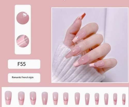 F55 Romantic French Press-On Nails — Icy-Sheer Nude Pink, Long Tapered-Square Shape (Finished Set)