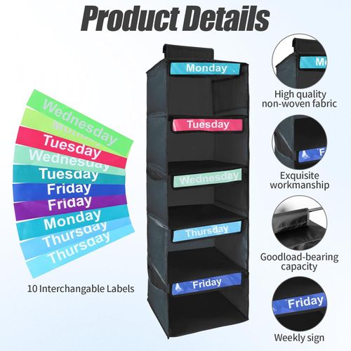 5-Shelf Weekly Clothes Organizer for Kids,Day of the Week Clothes Organizer,Dividers School Clothes Organizer Day of Week,Dorm Room Essential Daily Shelf Hanging Closet Organizer with 6 Side Pockets